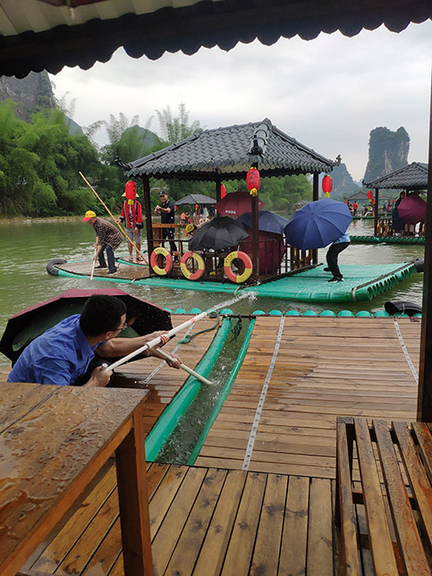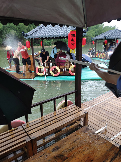 歷經(jīng)約40分鐘左右的戰(zhàn)斗結(jié)束,艄公緩緩把竹筏劃向碼頭。水戰(zhàn)非常激勵,基本上所有同事都濕身了,接下來就是回酒店沐浴更衣。