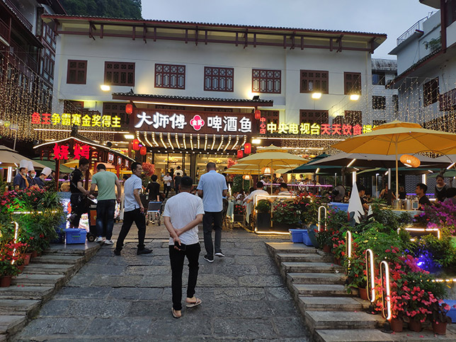 入住酒店后,6時集中到西街的大師傅啤酒魚就餐。不得不說的是陽朔的大師傅啤酒魚真的是滿大街密布。